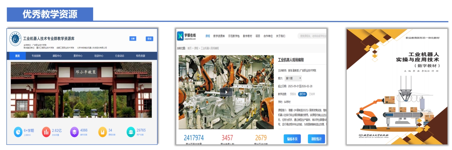 培养目标:本专业立足广安、面向川渝、服务全国,培养践行社会主义核心价值观,传承技能文明,德智体美劳全面发展,具有良好人文素养、科学素养、数字素养、职业道德、创新意识、爱岗敬业精神与工匠品质,掌握工业机器人技术相关知识与技能,具备工业机器人系统编程、维护、集成及自动化生产线调试等能力,能够胜任通用设备制造、专用设备制造等行业中工业机器人系统操作、运维、集成等岗位的高素质技能人才。