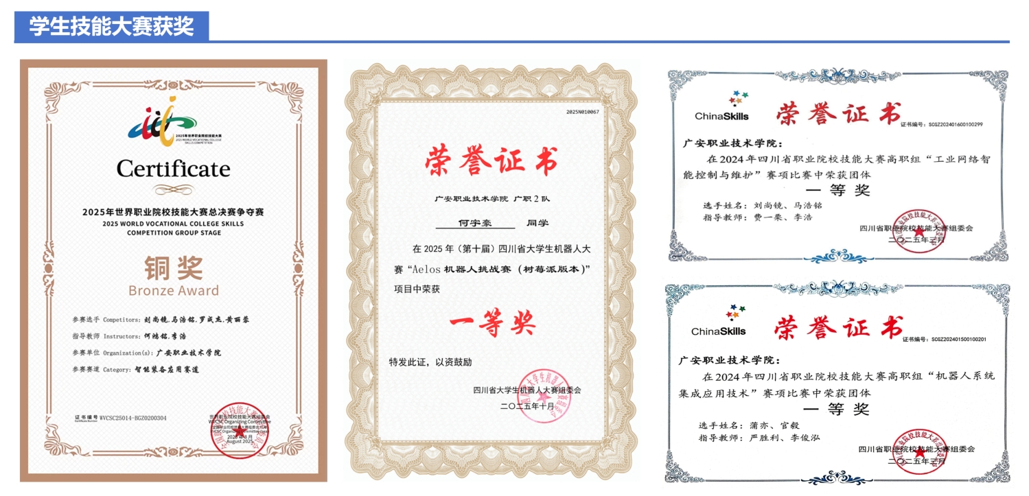 专业现有专任教师24名,其中高级职称教师11名,研究生以上学历占比75%上,“双师型”教师占比达83.33%,教学团队获评四川省第三批课程思政示范团队、四川省第四批职业教育教师教学创新团队;专业建有四川省名匠技艺技能传承创新平台、四川省劳模与工匠人才创新工作室、四川省知识产权信息公共服务网点、四川省中小微企业公共服务示范平台等省级科技创新平台,建有工业机器人系统集成综合实训室、智能控制实训室、视觉检测实训等校内实训场地,占地面积为5000余平方米,设备总台套数达70台(套),工位400余个,总价值达2000余万元;专业与北京华航唯实、重庆华数机器人、深圳越疆机器人等行业优质企业深度开展校企合作,建成华航唯实机器人现代产业学院,建有校外实习实践教学基地60余个;专业学生近三年获得技能竞赛和双创竞赛奖励90余次,双证获取率达85%以上,就业率平均保持在98%以上。多名学生荣获“四川省青年岗位能手”等省级荣誉,60余人被中国工程物理研究院(绵阳九院)、四川领克汽车制造有限公司等国有企业及行业龙头企业录用。